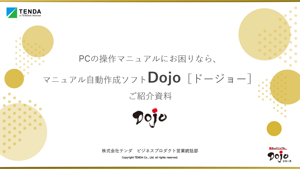 本資料の内容 ・マニュアル作成の課題 ・自動マニュアル作成ソフト「Dojo」でできること ・「Dojo」の活用方法 ・実際の導入事例 ・価格と投資対効果 ・サポートや動作環境について