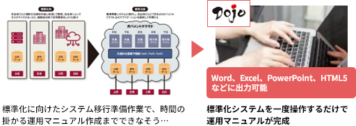 異動時だけでなく、日常の業務からマニュアル作成が進められます。 - Dojoで作成した引継ぎ書には、必要な追記も可能。WordやExcel、PowerPoint、HTML5などで出力してもその情報が反映されるため、共有しやすくセキュリティ面でも安心。