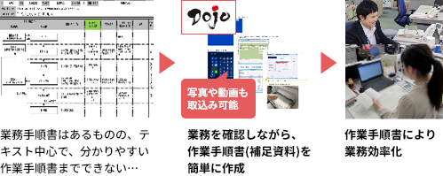 - 業務手順書に沿ってシステム操作を行うだけで、作業手順書(補足資料)を簡単に作成できます必要に応じて現場の写真や動画も取り込めます。