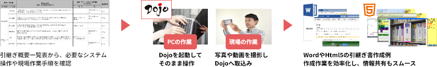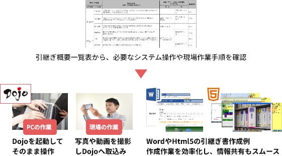 - Dojoを使えば、システム操作は通常業務の中で自動記録され、簡単に引継ぎ書を作成可能。写真や動画も取り込めるため、現場の業務もわかりやすく引き継ぐことができます。