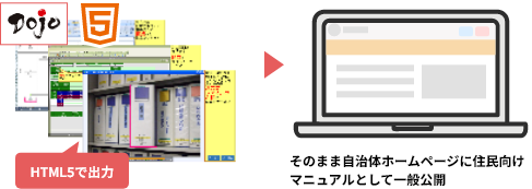 - Dojoを活用すれば、住民向け手順書を簡単に作成・公開でき、庁内利用にとどまらず自治体ホームページなどで共有することも可能です。