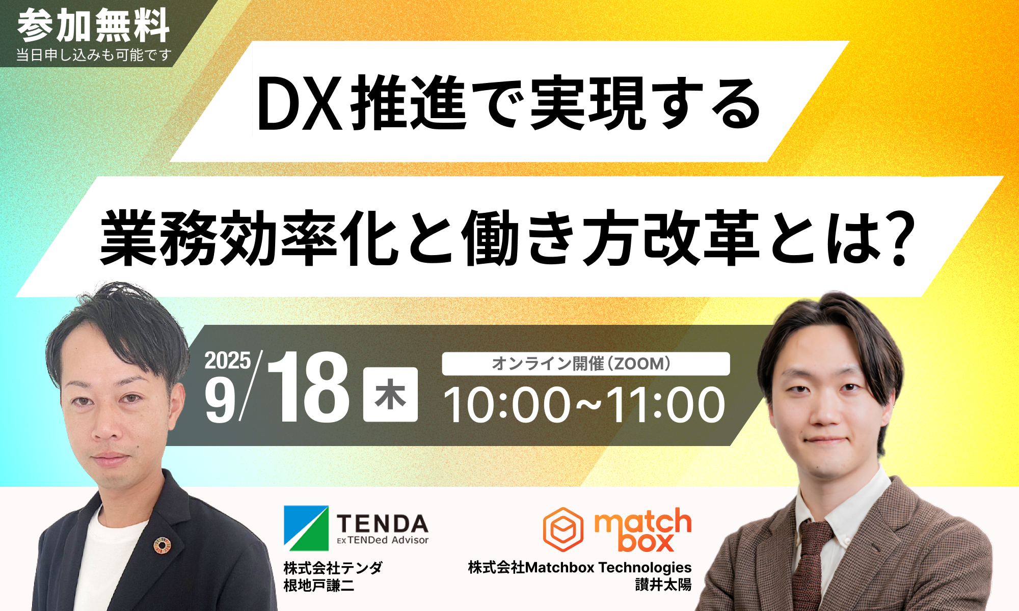 マニュアルトータルソリューションを軸に「ホワイトカラーの業務効率化」を推進する株式会社テンダ(本社/東京都渋谷区、代表取締役会長兼社長CEO/薗部 晃、以下「テンダ」)は、株式会社Matchbox Technologiesと共に、オンラインウェビナー『DX推進で実現する業務効率化と働き方改革とは?』 を2025年9月18日(木)に開催いたします。